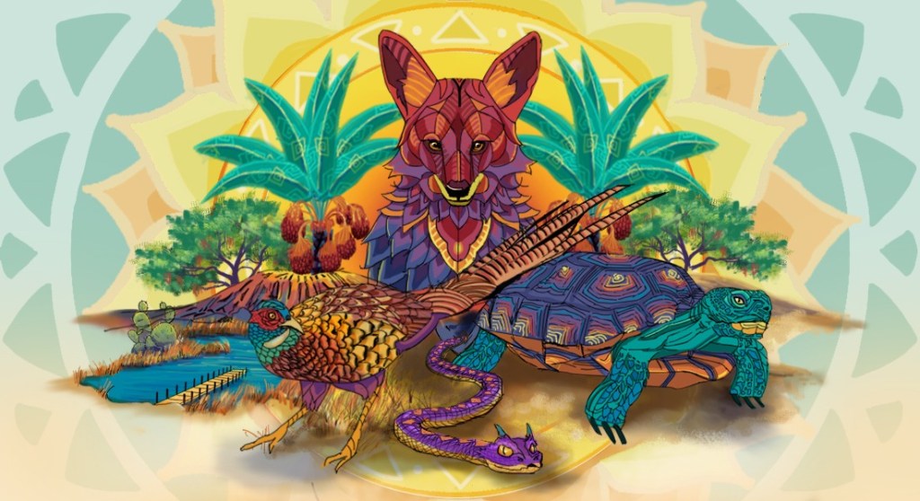 Por otra parte, Brújula del Desierto es una obra que involucra un panorama más amplio de elementos y que abarca un sentido más natural de la región, incorporando elementos característicos de la flora y la fauna como la Ciénega de Santa Clara, el Pinacate y las palmas datileras junto con La Tortuga del Desierto, El Correcaminos Californiano, la serpiente de Cascabel Cornuda y el Lobo Mexicano, todo frente al Sol característico del desierto, representado a través de los colores icónicos de la etnia Cucapá.