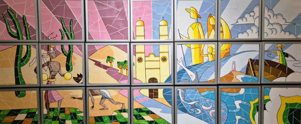 Comenzando con la obra del Mtro. Juan Antonio, Nuestras Raíces muestra una comunidad donde converge la tradición, la cultura y la historia, aglomerando en sí los principales elementos que nos han acompañado durante el desarrollo de la región como; el desierto (el gran desierto del Altar), la pesca y el machorro (el Golfo), los grupos originarios (los Cucapá que habitan la localidad y los Yaquis representando a Sonora), el algodón en la esquina inferior derecha, en el centro el Río Colorado y por último, resaltando sobre el mar, los pioneros que llegaron para habitar la localidad.